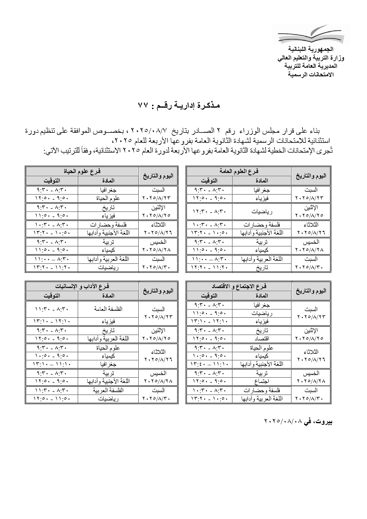 الدورة الاستثنائية للامتحانات الرسمية لشهادة الثانوية العامة بفروعها الأربعة للعام 2025